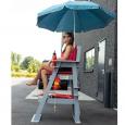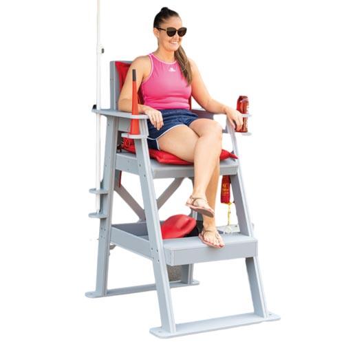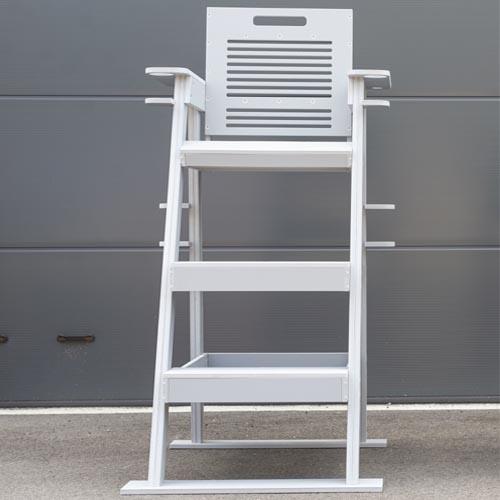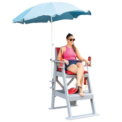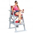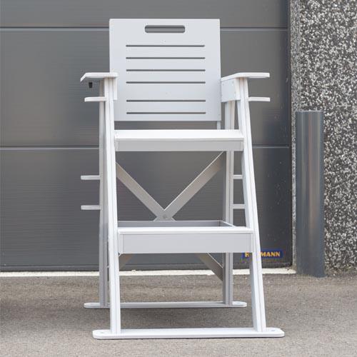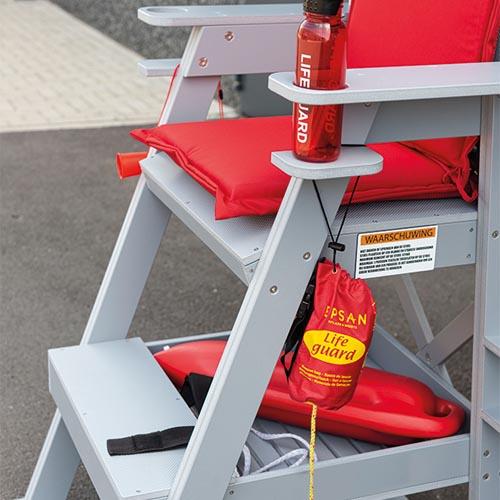 Badmeesterstoel voorzien van een ergonomisch gevormd zitvlak en twee brede armsteunen. De zitting en rug zijn voorzien van openingen om verluchting te kunnen bieden. De treden, zitting en rugleuning zijn voorzien van een driedimensionale structuur dat zorgt voor een zeer goede antislip, antislip voldoet aan DIN 51097 en DIN 51130. De badmeesterstoel is voorzien van twee parasol houders en twee houders voor een flesje/bidon. De badmeesterstoel heef één opbergvak, hier kun je bijvoorbeeld reddingsmaterialen kwijt zoals AED, zuurstofkoffer of EHBO-tas. De stoelpoten zijn voorzien van grond verankeringsopeningen.