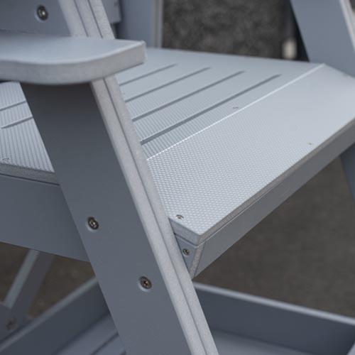 Badmeesterstoel volledig gemaakt uit kunststof. Het kunststof (PP-REP) is een geëxtrudeerd polypropyleen hardschuim met een hoge UV bestendigheid. De fijne oppervlakte structuur van de toplaag zorgt voor een uitstekende krasbestendigheid en vanwege de gesloten celstructuur neemt het materiaal nagenoeg geen vocht op. De badmeesterstoel is volledig recyclebaar.