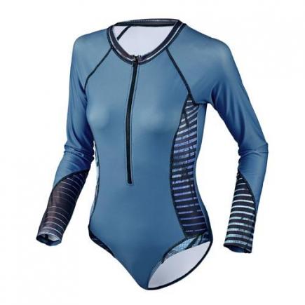 BECO dames badpak met lange mouwen. Het badak met lange mouwen behoort tot de collectie BEactive swimwear en is ideaal voor aquafitness workouts en watersporten. Het badpak is een regular fit model en heeft een normale pasvorm. Het badpak in petrol ziet er dankzij de blauwe en zwarte print aan de zijkanten mooi en sportief uit. Het badpak is voorzien van een ritssluiting op de borst. Combineer het badpak met andere zwemkleding uit de BEactive collectie, bijvoorbeeld een T-back bikini, deze kun je comfortabel dragen onder dit badpak. Badpak gemaakt uit polyester, polyamide en elastaan.Print: 80% polyamide / 20% elastaanUni: 85% polyester / 15% elastaan Voor de juiste maat, bekijk de maattabel. LET OP: dit is een uitlopend artikel, indien een bepaalde maar niet meer op voorraad is, dan kun je deze niet meer bestellen