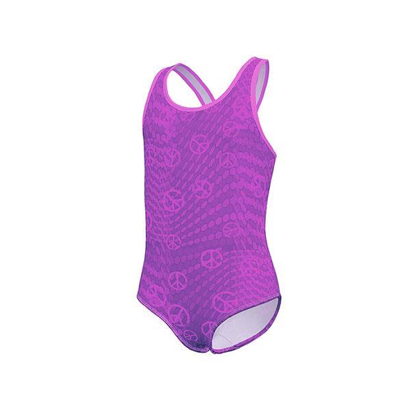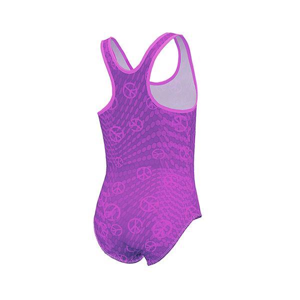 Het BECO peace badpak voor meisjes heeft een roze gekleurd patroon op een paars donkerkleurige achtergrond en ziet er mooi en sportief uit en is ideaal voor op het strand en in het zwembad.