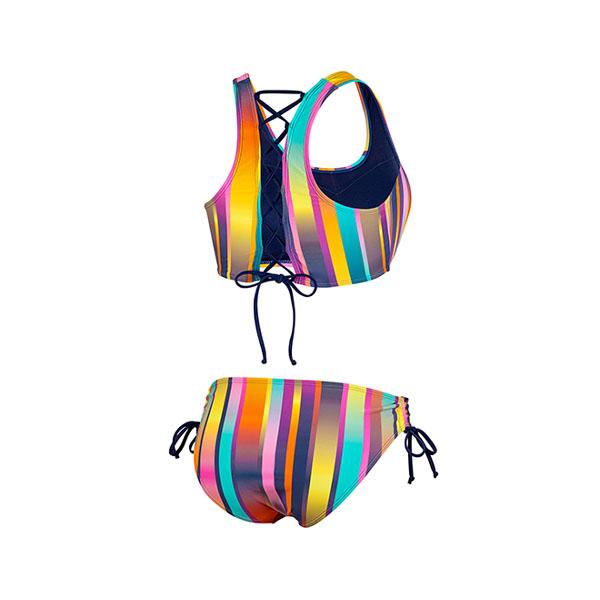 De summer stripes zwemkleding is fel en vrolijk gekleurde zwemkleding in een gestreept design. De zwemkleding heeft mooie zomerse kleuren met een zacht kleurverloop op een middernachtblauwe ondergrond. De crop top bikini is corset model en is volledig gevoerd, zowel aan de voorkant als aan de achterkant. De bikini heeft een racerback achterkant met koordsluiting. Dankzij de koordjes is de bikini in breedte verstelbaar. De bikini is verder voorzien van uitneembare pads. Het bikini broekje is eveneens gevoerd en voorzien van klassieke strikjes.
