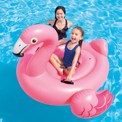 De Intex pink flamingo ride-on is een opblaasbare flamingo en leuk om mee te spelen in het zwembad of om lekker op te liggen relaxen. De roze opblaas flamingo is gemaakt uit vinyl met een dikte van 0,30 mm en bestaat uit twee luchtkamers. De opblaasbare flamingo is hartstikke leuk om mee te spelen in het zwembad en om lekker op te drijven. De opblaas flamingo is verder uitgerust met twee handvaten.